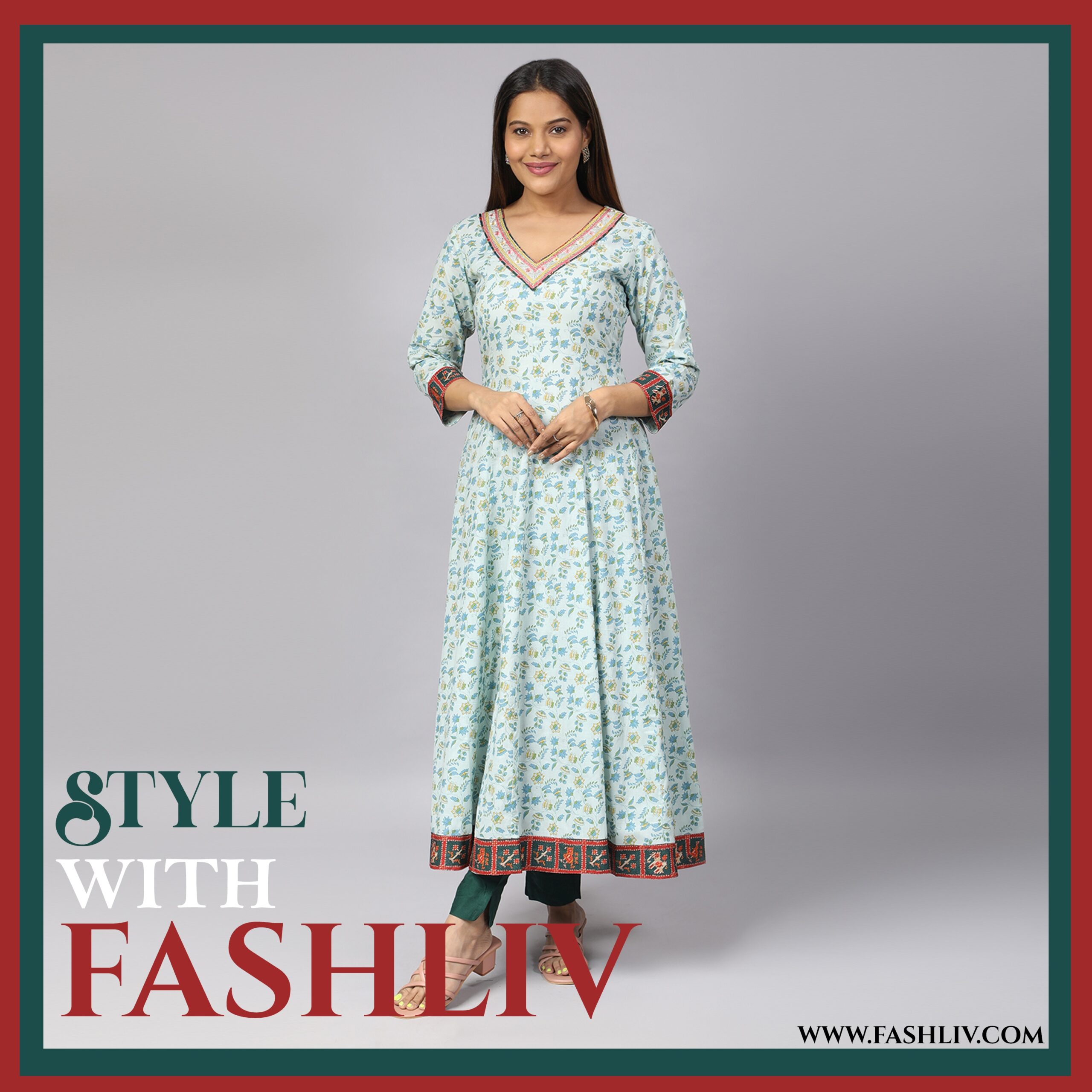 Light Blue With Floral Printed Anarkali Kurta Pant Set