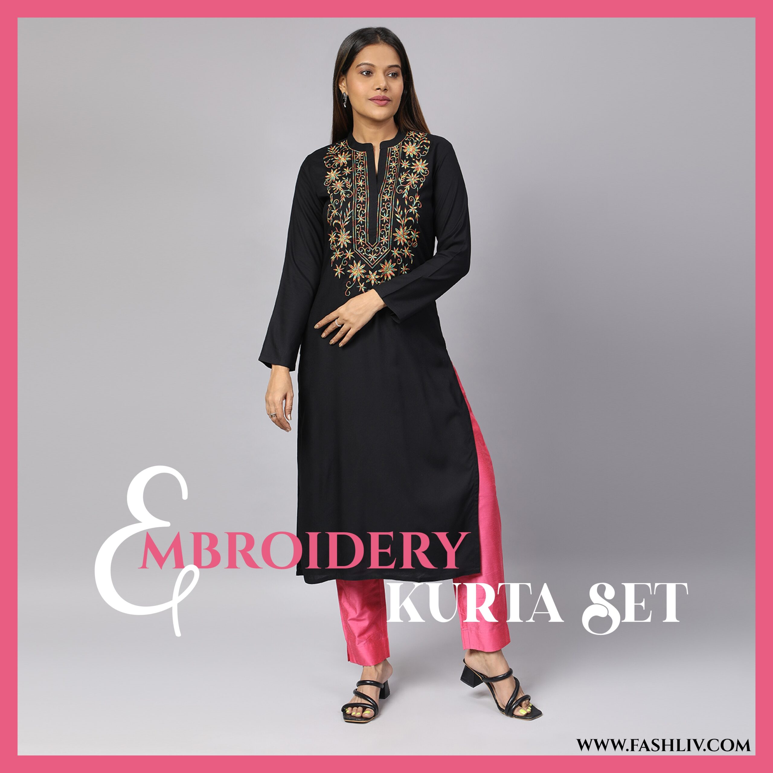 Floral Neck Embroidery Black Kurta And Pink Pant Set